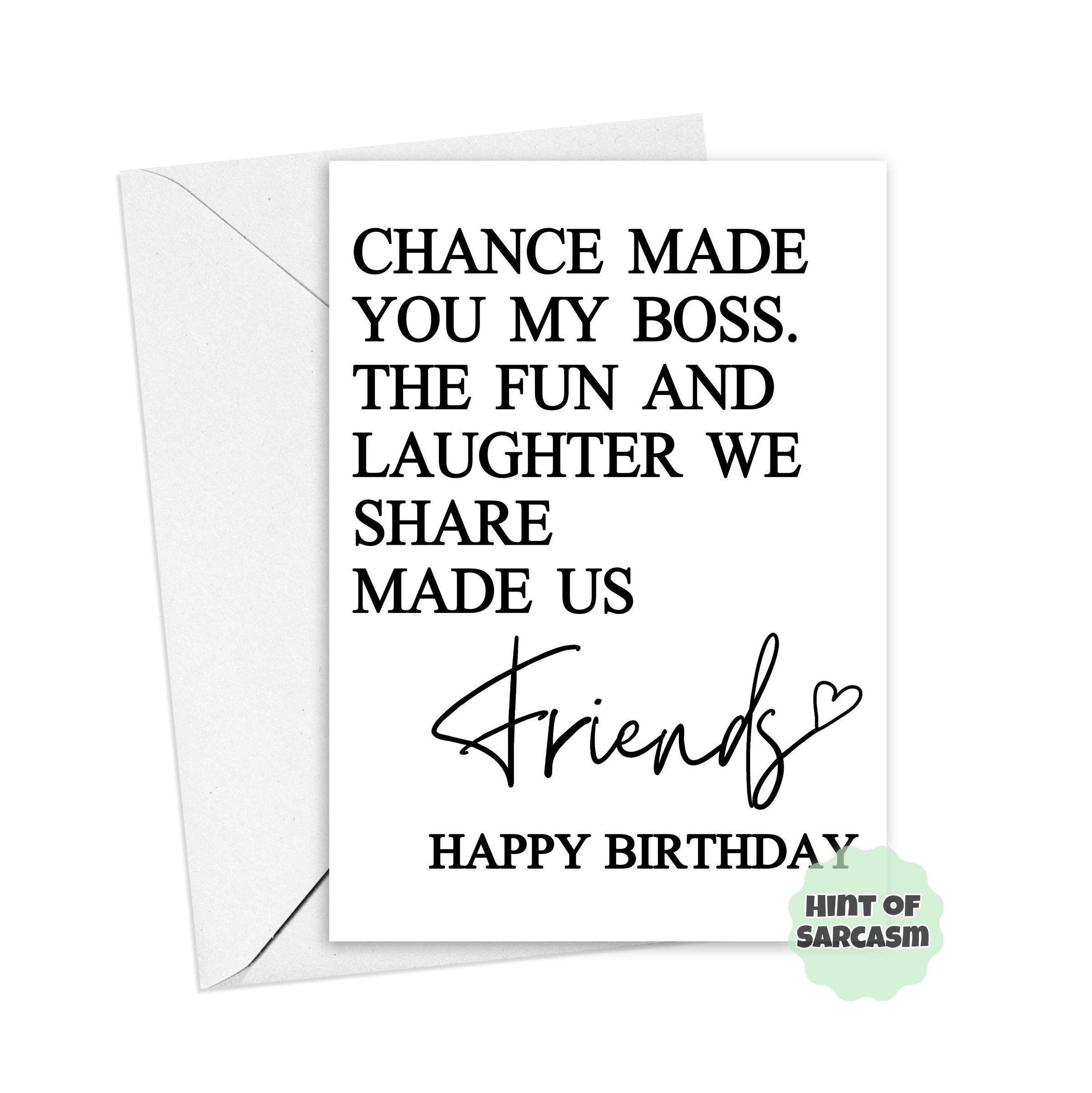 Happy Birthday To My Boss And Friend A5 Chance Made You My Boss Fun and Laughter Birthday Card Work : Happy birthday to my best friend, my person Thankfully, I have the best manager around! Happy birthday, boss. We all know how much hard work you’ve put in over the past few months. . Here are some thoughtful and professional birthday wishes to make your boss and colleagues feel special on their big day. WISHING YOUR BOSS: Happy Birthday, Boss! Your leadership and guidance inspire .